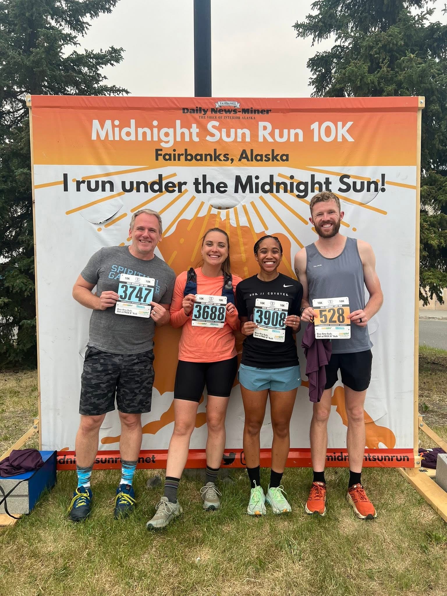Fairbanks is also famous for the long summer days, known as the Midnight Sun! This phenomenon is celebrated every year the Saturday after Solstice with a Solstice festival that goes until Midnight, because you can do things like that when you have 22 hours of daylight! I was lucky enough to be there on Solstice this year and attend the festival. There was a massive town celebration and even a 10pm baseball game. Despite starting at 10pm, it’s played completely without artificial light. I couldn’t snag a ticket, but I found something even better, a 10pm 10K run! One of my coworkers and some of his guests joined. There were 3,900 runners this year, and I think just as many spectators. I couldn’t believe the amount of people hanging out on their lawns, out cheering us on. I also couldn’t believe that we crossed the finish line and made it back to the hotel with the sun still out. I was so tired the next day.. We had a very early morning, but I am so glad I did it. We grabbed this photo right before the race started!