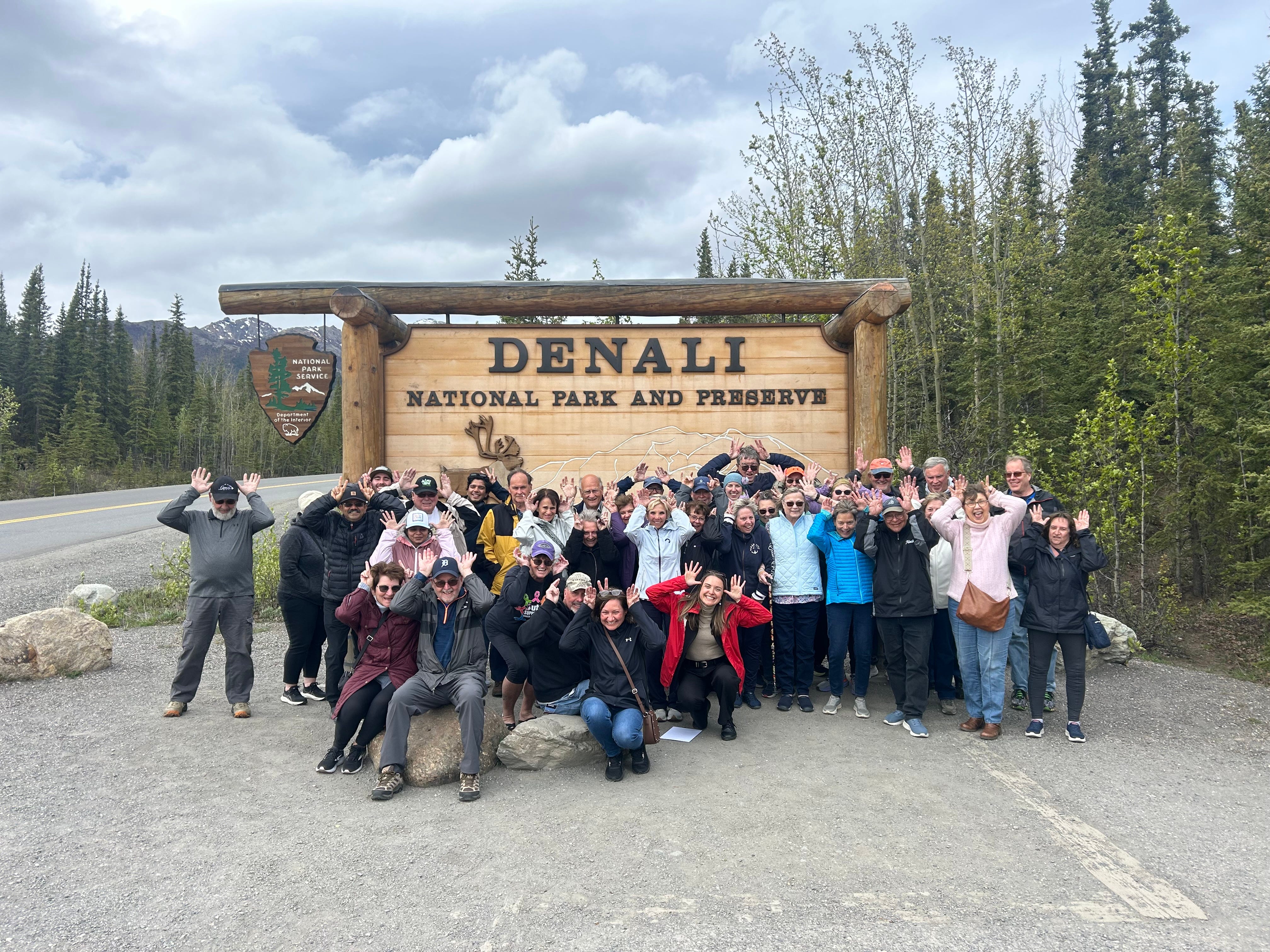 I have now led four trips on my own and I love it. It’s wild to think that just a month ago, I was nervous about speaking into a microphone during training. Now? I’m comfortably talking (a lot) on a moving motorcoach full of people. So far, I’ve had groups ranging from 36 to 46 guests, but they can get up to 52! Every group has been filled with amazing, enthusiastic people who are excited to be here. I am genuinely sad when they leave. It’s amazing how well I get to know them in our short time together and what an impact they all have made on me so far. Pictured below is my first group and I doing our moose antlers outside of Denali.